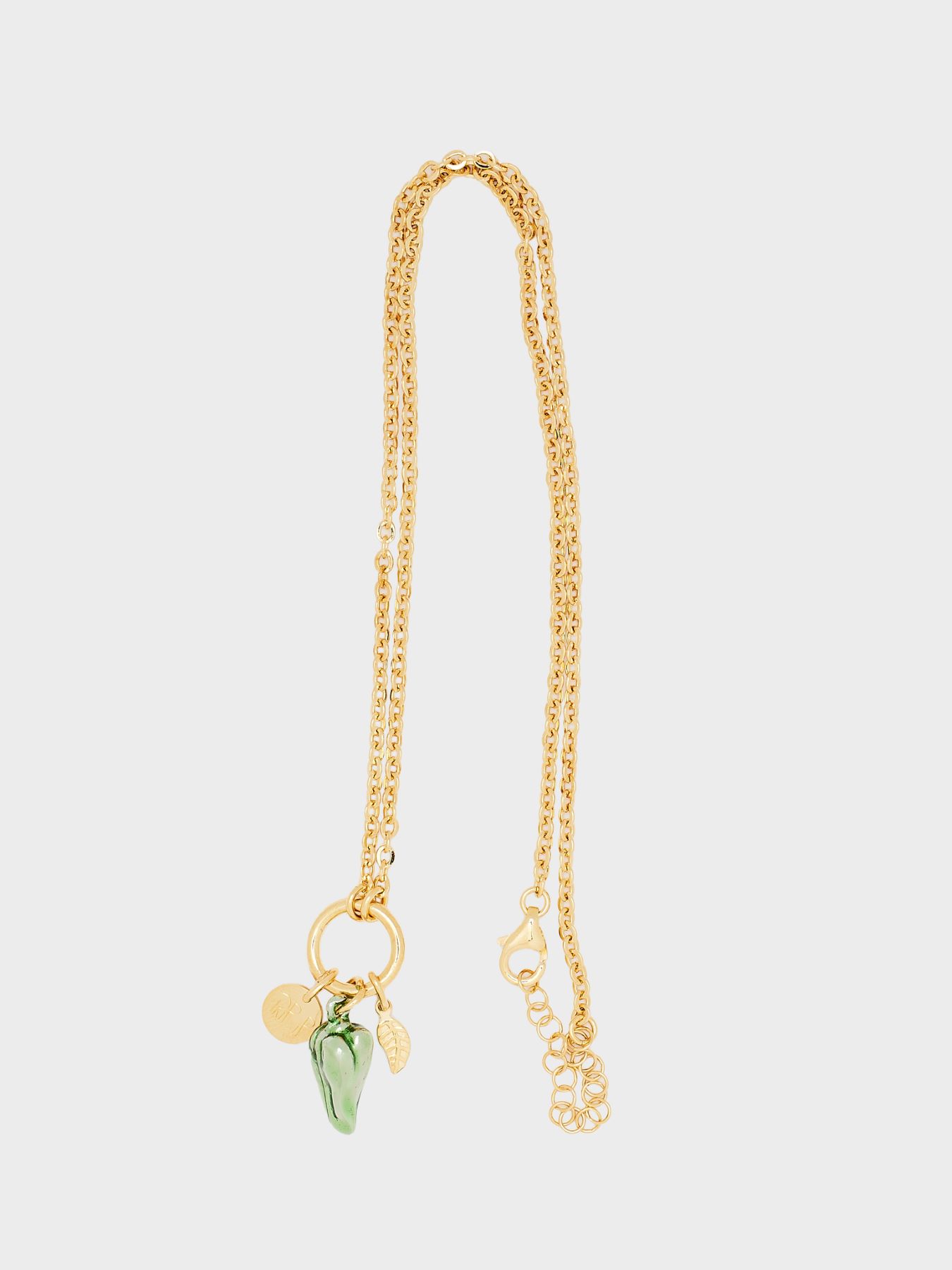 Necklace with baby pendant tipology Habanero colour green with leaf, zircon and plate Rip.Ip. Adjustable chain cm. 45+cm.5. Lobster claps. HAND MADE, HAND PAINTED AND MADE IN ITALY. COLLECTION RIP.IP. Basic Line.