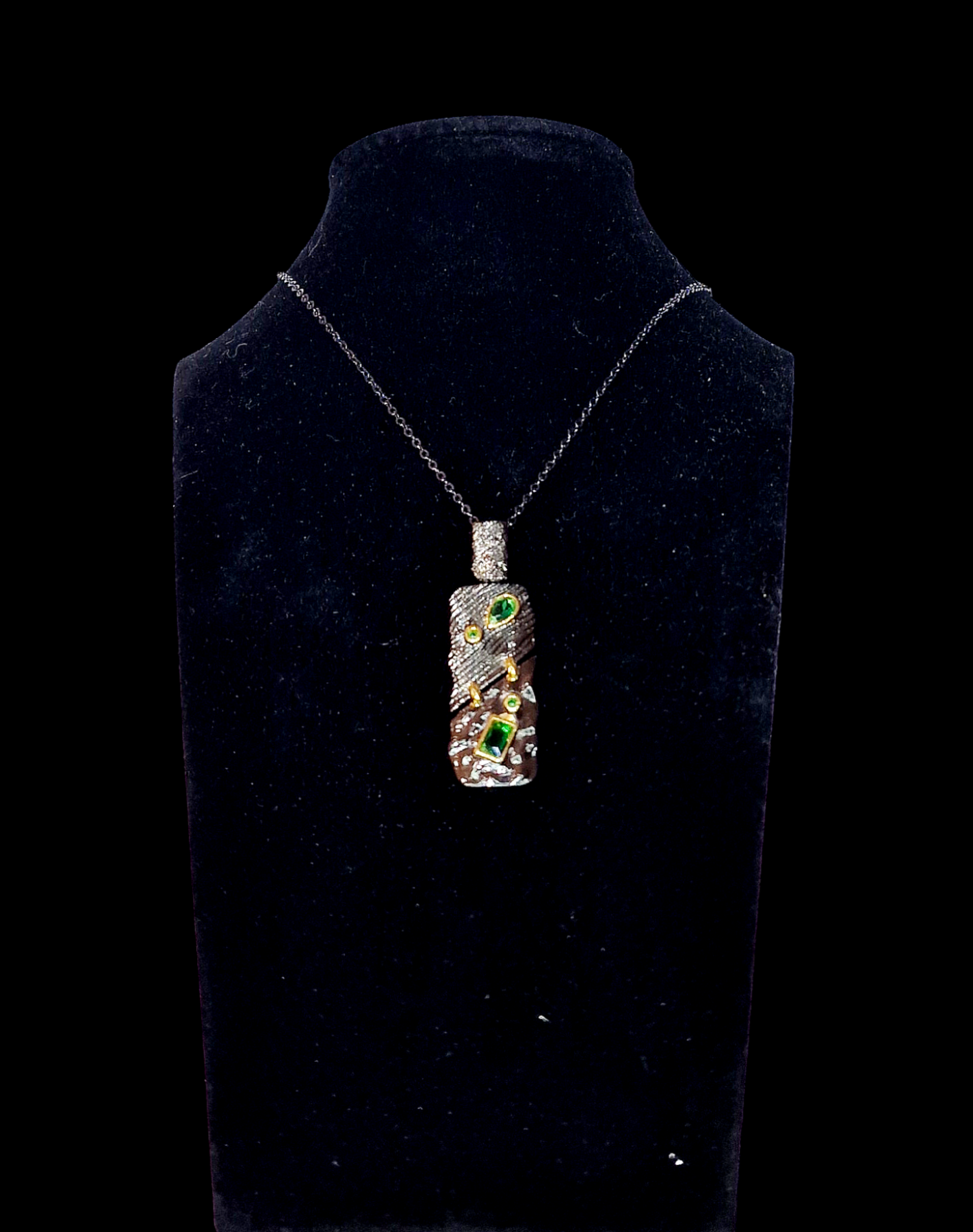Collezione ESTRUSCA SELVAGGIA Linea Larthia. Collana con ciondolo Linea Larthia collezione realizzato in Argento 925 brunito con zirconi verdi. Tipologia catena: forzatina. Lunghezza catena cm 42 + 5 cm di estensione per un totale di cm. 47. Chiusura collana con anello a molla. Prodotto artigianale, assemblato a mano e made in Italy.