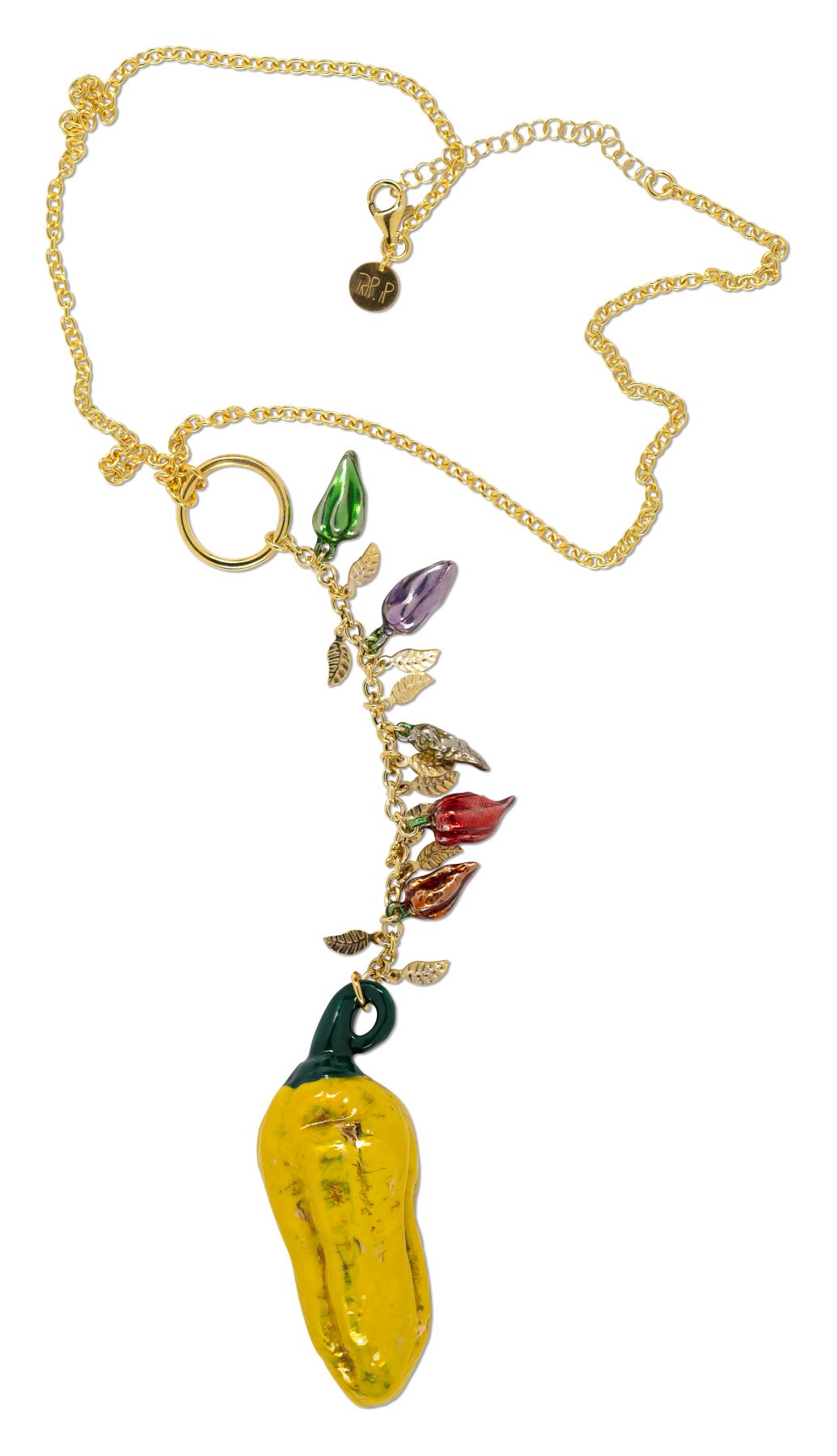 Collana con pendente realizzata in Argento 925 placcata oro con peperoncino JALAPENO in Argento 925 placcato oro smaltato GIALLO e fila di peperoncini neonati misti (tipologia: Red Scorpion, Yellow Scorpion, Habanero, Fatalii e Jalapeno) smaltati rosso, arancione, viola, giallo e verde realizzati in Argento 925 con foglioline in Argento 925 placcate oro. Lunghezza catena regolabile cm. 45 più cm 5 per un totale di cm. 50. Chiusura a moschettone con targhetta Rip.Ip. PRODOTTO ARTIGIANALE E DIPINTO A MANO. Collezione Rip.Ip.