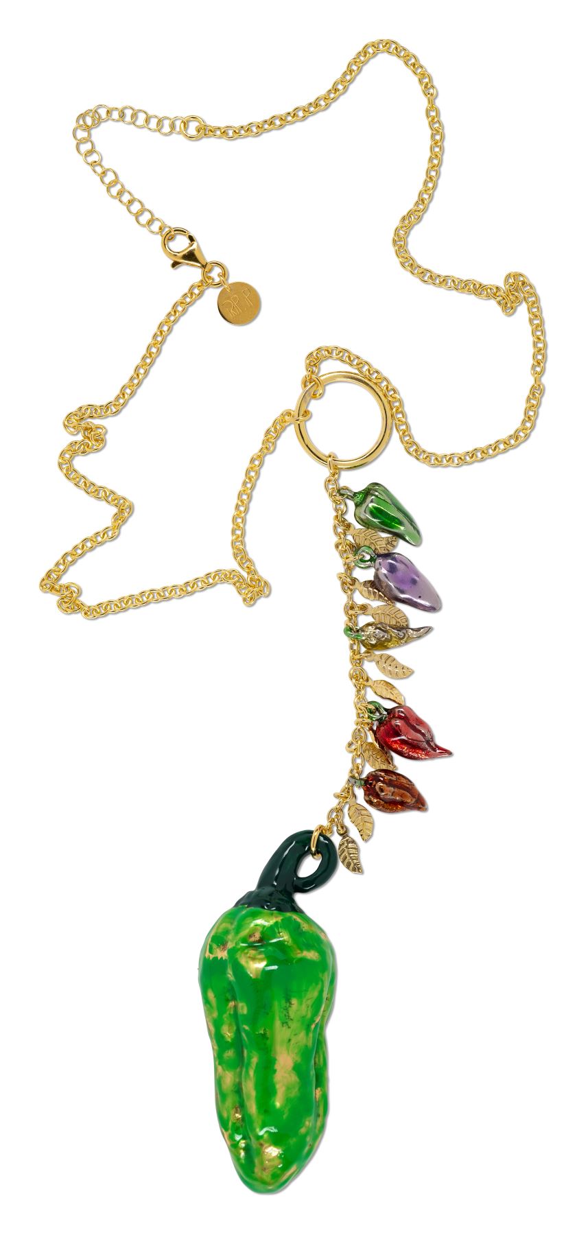 Collana con pendente realizzata in Argento 925 placcata oro con peperoncino JALAPENO in Argento 925 placcato oro smaltato VERDE e fila di peperoncini neonati misti (tipologia: Red Scorpion, Yellow Scorpion, Habanero, Fatalii e Jalapeno) smaltati rosso, arancione, viola, giallo e verde realizzati in Argento 925 con foglioline in Argento 925 placcate oro. Lunghezza catena regolabile cm. 45 più cm 5 per un totale di cm. 50. Chiusura a moschettone con targhetta Rip.Ip. PRODOTTO ARTIGIANALE E DIPINTO A MANO. Collezione Rip.Ip.