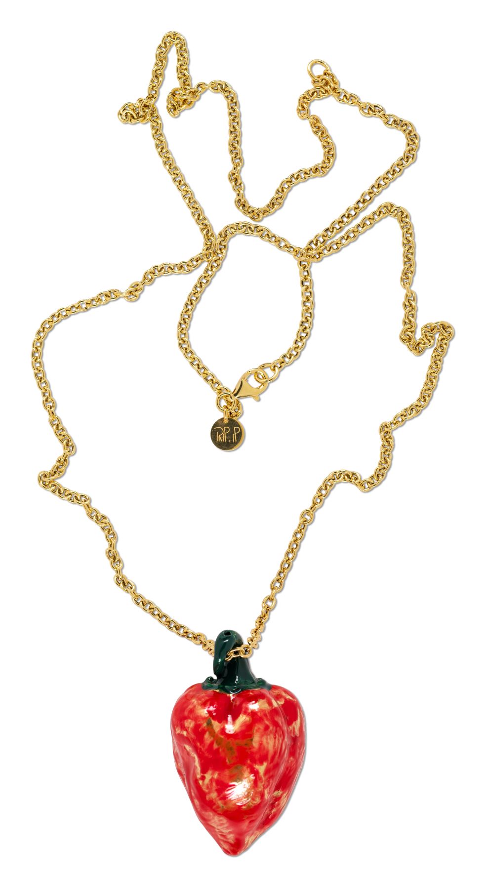 Collana solo pendente realizzata in Argento 925 placcata oro con peperoncino HABANERO in Argento 925 placcato oro smaltato ROSSOVIVO. Lunghezza catena regolabile cm 70 più cm. 10 per un totale di cm. 80. Chiusura a moschettone con targhetta Rip.Ip. PRODOTTO ARTIGIANALE E DIPINTO A MANO. Collezione RIP.IP.