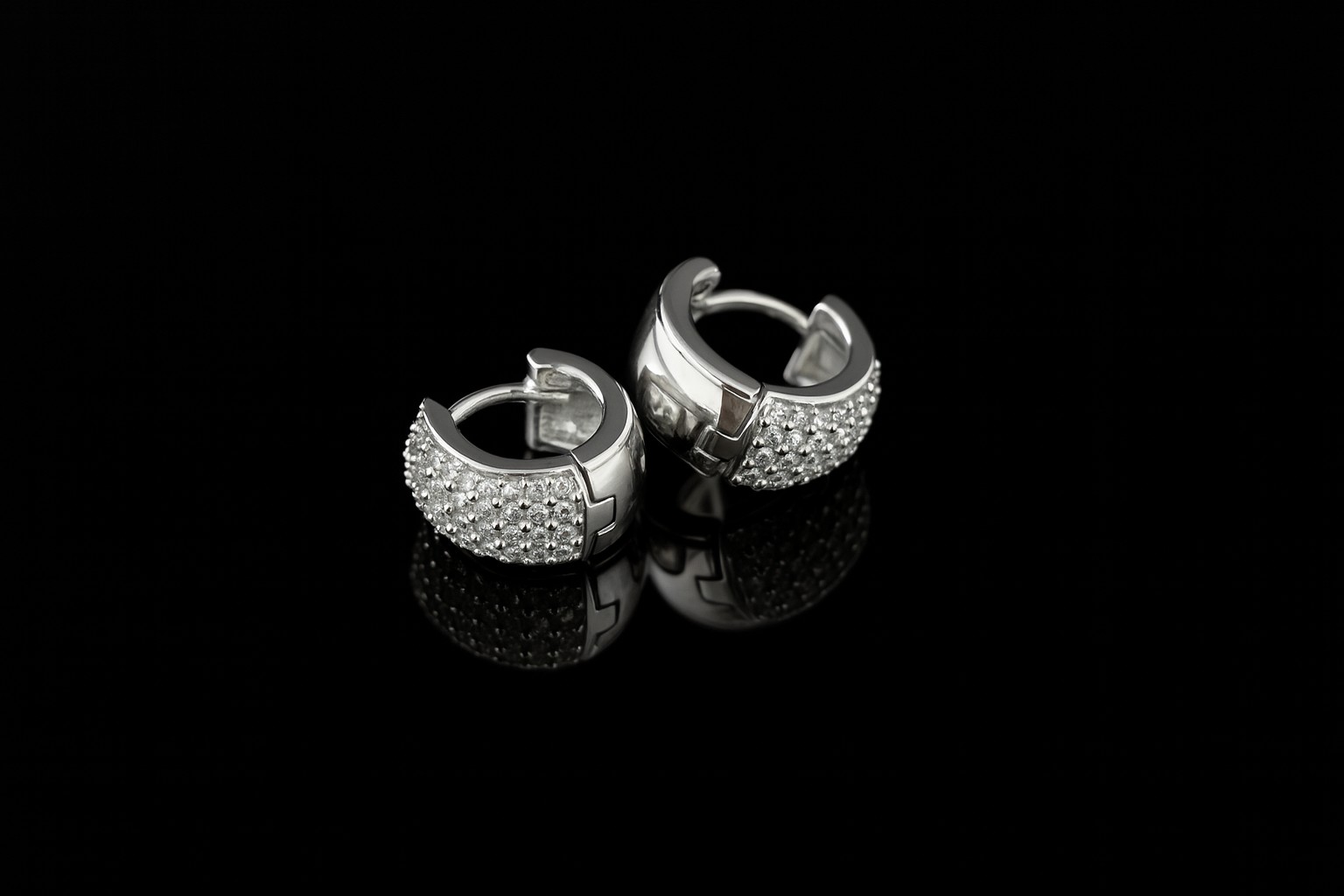 Orecchini a cerchio realizzati in Argento 925 con pavè di zirconi swaroski. Diametro cm. 1, spessore cm. 0,5, timbratura metallica e chiusura ad incastro. Prodotto artigianale e made in Italy.