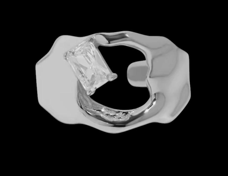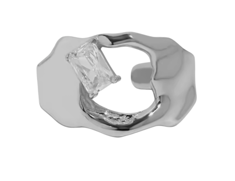 Anello realizzato in Argento 925 a forma irregolare con pietra trasparente rettangolare swaroski. Misura regolabile. L’anello è creato artigianalmente e incastonata a mano. Nichel free e Made in Italy.