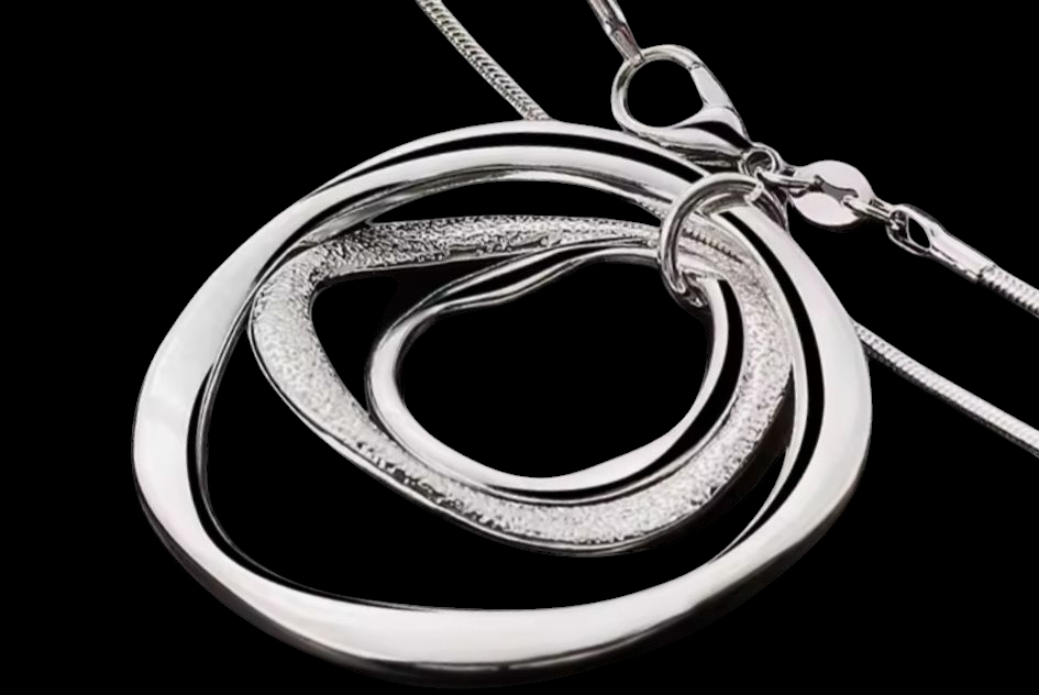 Collana realizzata in Argento 925 con tre strati di cerchi piatti irregolari. Il cerchio di mezzo è stile martellato mentre gli altri due cerchi sono stile lucido. La catena è stile serpentina e la lunghezza è di cm. 50 con chiusura a moschettone. Realizzata e lavorata artigianalmente, nichel free e Made in Italy.