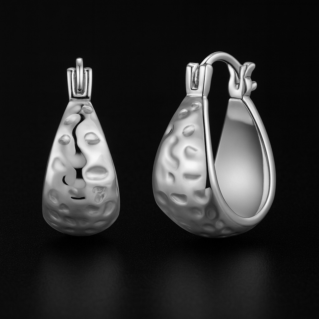 Orecchini realizzati in Argento 925 martellati a mano e chiusura a scatto. Lunghezza orecchini cm. 2. Realizzati artigianalmente, nichel free e made in Italy.