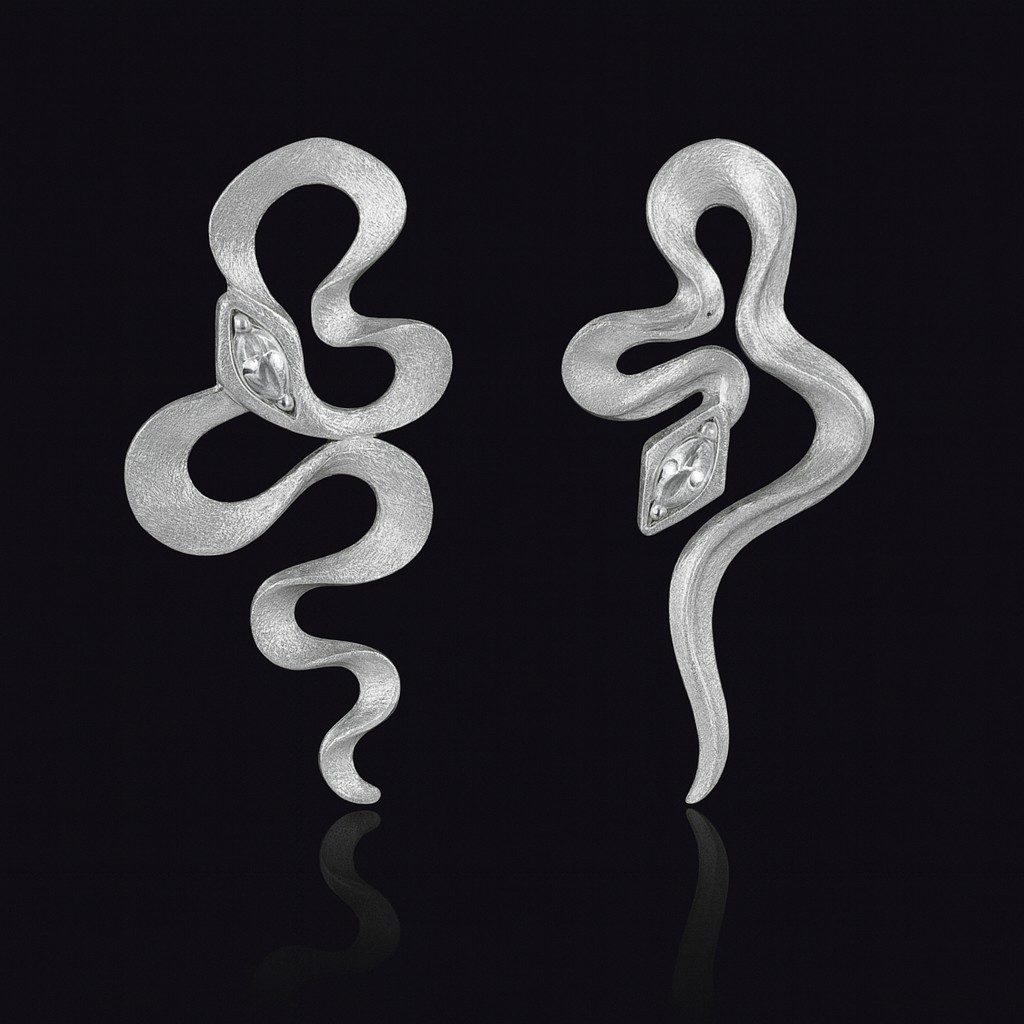Orecchini realizzati in argento 925 spazzolato a forma di serpente irregolare. La testa ha un cristallo diamantato a forma di rombo. Il peso è di circa 3,10 grammi per una lunghezza di cm. 3. Chiusura a farfallina. Realizzati artigianalmente, incastonati a mano e made in Italy.