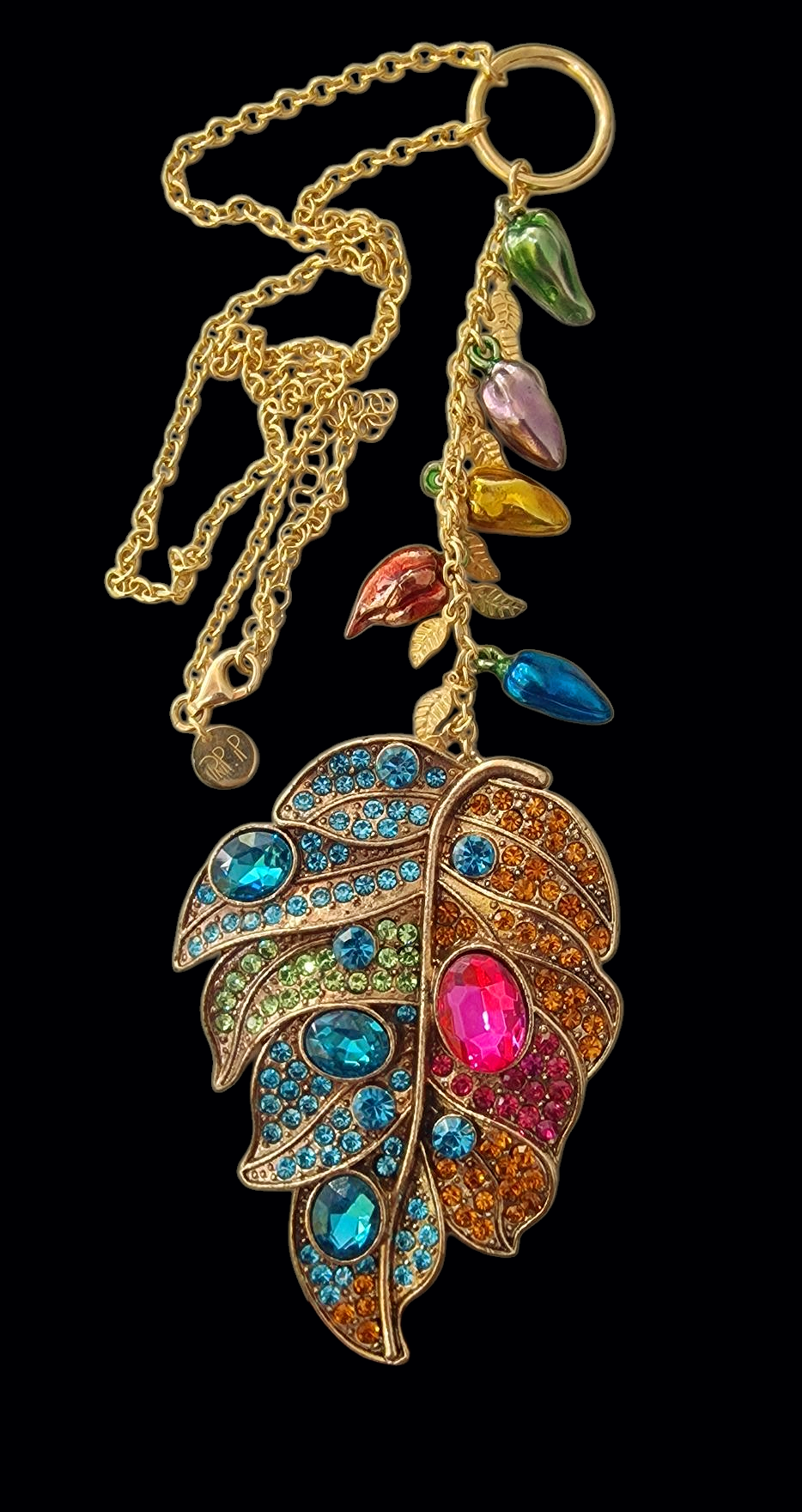 Collana realizzata in Argento 925 composta da cinque tipologie di peperoncino (baby jalapeno, baby, scorpion, baby fatalii e baby habanero) smaltati a mano: blu elettrico, dorato, giallo, rame, verde con grande ciondolo a forma di foglia con swaroski colorati rosa, arancio azzurro e verde. Lunghezza catena cm. 45 con chiusura a moschettone e targhetta Rip.Ip. Prodotto artigianale, smaltato a mano, incastonato a mano e Made in Italy. Gioiello unico.