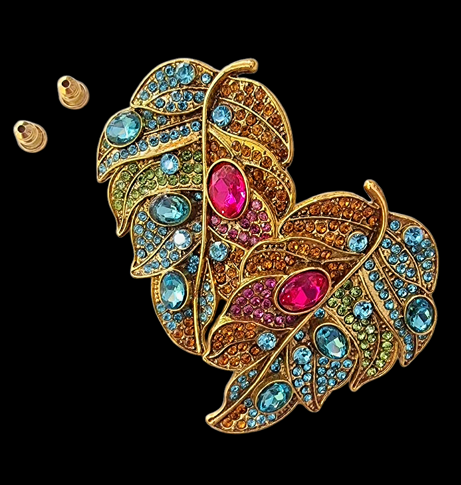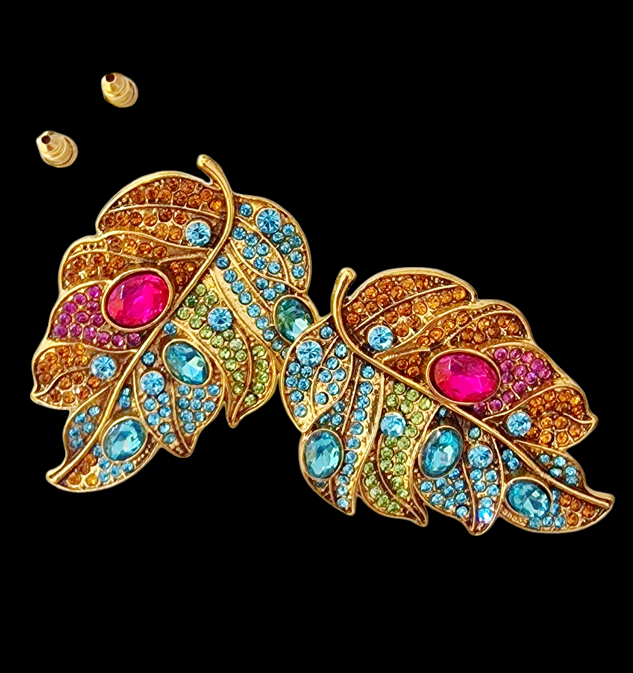 Orecchini realizzati in Argento 925 e materiali misti bagnato in oro e lavorato in stile anticato a forma di foglia con pietre swaroski color azzurro, rosa, arancio e verde. Lunghezza orecchino cm. 4,5 con chiusura a farfallina. Realizzato artigianalmente, incastonato a mano e Made in Italy.