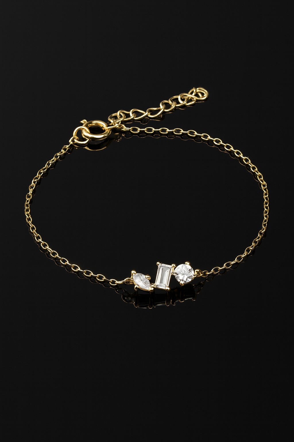 Bracciale realizzato in argento 925 bagnato in oro 18 kt. a tre forme con cristalli diamantati. Lunghezza cm. 16 più 3 cm di estensione per un totale di cm. 19, peso 2 grammi circa. Realizzato artigianalmente e made in Italy.
