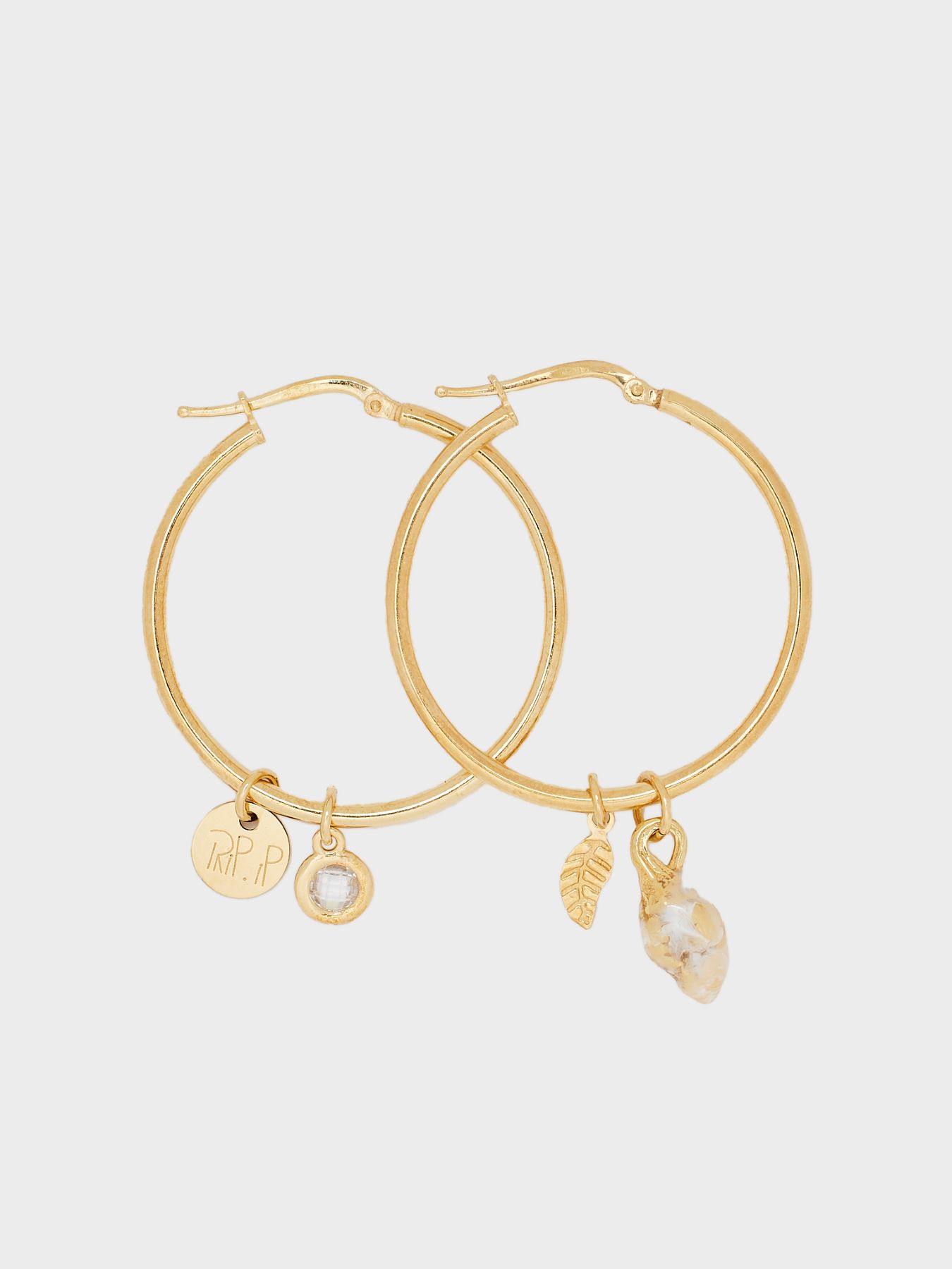 Coppia di orecchini a cerchio con ciondolo HotDaisy smaltato bianco e fogliolina, punto luce zircone bianco e targhetta Rip.Ip. Materiale utilizzato Argento 925 placcato oro. PRODOTTO ARTIGIANALE E DIPINTO A MANO. MADE IN ITALY. Collezione rip.Ip.