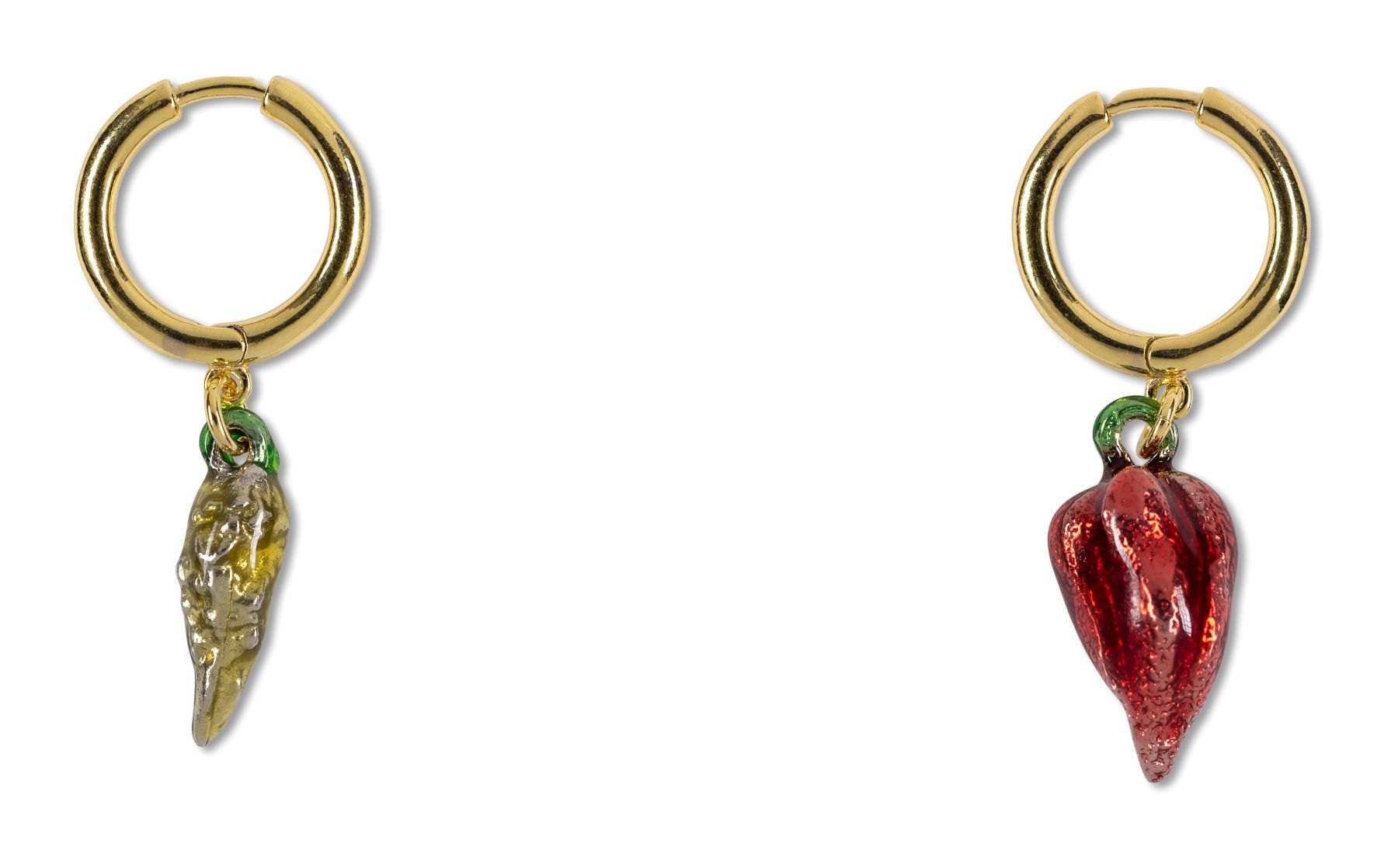 Paio di orecchini pendenti a cerchio con chiusura ad incastro realizzati in Argento 925 placcati oro con peperoncini misti neonati (tipologia Scorpion e Fatalii) realizzati in Argento 925 smaltati ROSSO e GIALLO. Lunghezza cm. 3,5. PRODOTTO ARTIGIANALE E DIPINTO A MANO. NON VENDIBILE SEPARATAMENTE. Collezione Rip.Ip.