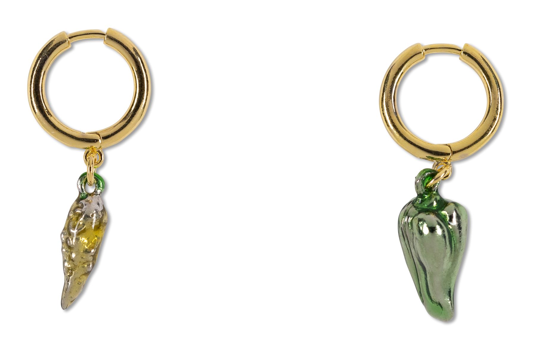 Paio di orecchini pendenti a cerchio con chiusura ad incastro realizzati in Argento 925 placcati oro con peperoncini misti neonati (tipologia Habanero e Fatalii) realizzati in Argento 925 smaltati VERDE e GIALLO. Lunghezza cm. 3,5. PRODOTTO ARTIGIANALE E DIPINTO A MANO. NON VENDIBILE SEPARATAMENTE. Collezione Rip.Ip.