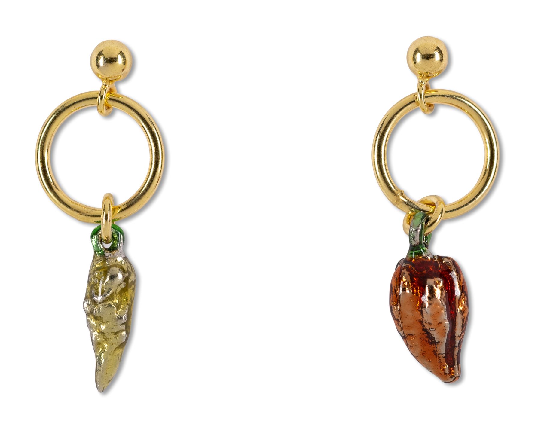 Paio di orecchini pendenti con pallino e chiusura a farfalla realizzati in Argento 925 placcati oro con peperoncini misti neonati (tipologia: Fatalii e Scorpion) in Argento 925 smaltati GIALLO E ARANCIONE. Lunghezza cm. 3. PRODOTTO ARTIGIANALE E DIPINTO A MANO. NON VENDIBILI SEPARATAMENTE. Collezione Rip.Ip.