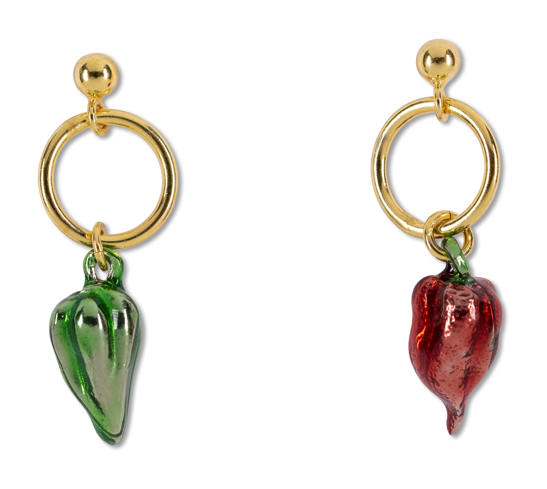 Paio di orecchini pendenti con pallino e chiusura a farfalla realizzati in Argento 925 placcati oro con peperoncini misti neonati (tipologia: Habanero e Scorpion) in Argento 925 smaltati ROSSO E VERDE. Lunghezza cm. 3. PRODOTTO ARTIGIANALE E DIPINTO A MANO. NON VENDIBILI SEPARATAMENTE. Collezione Rip.Ip.