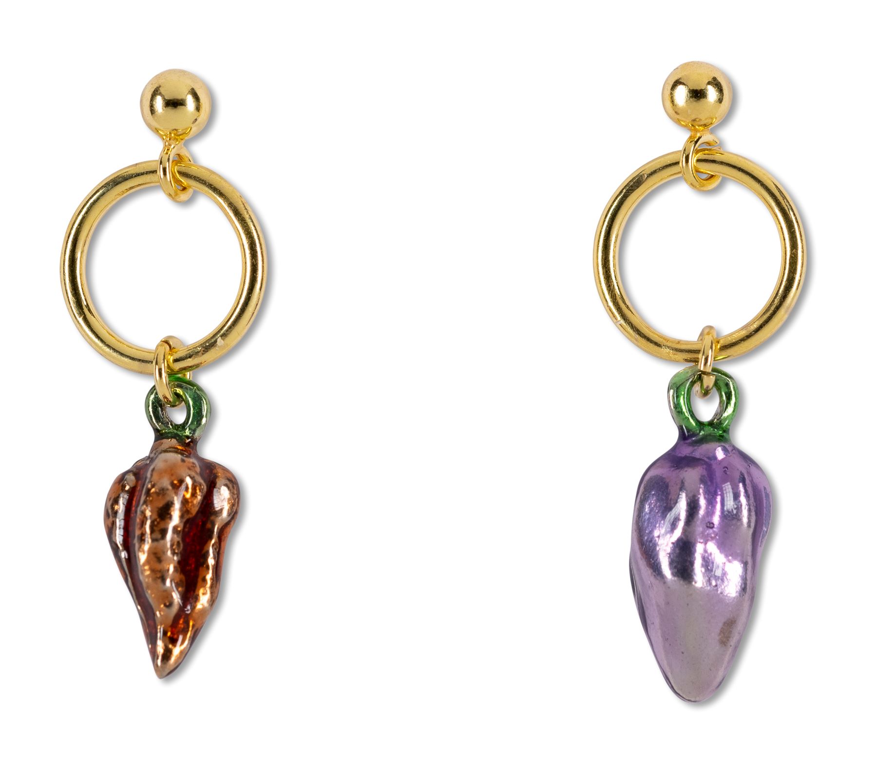 Paio di orecchini pendenti con pallino e chiusura a farfalla realizzati in Argento 925 placcati oro con peperoncini misti neonati (tipologia: Jalapeno e Scorpion) in Argento 925 smaltati ARANCIONE E VIOLA. Lunghezza cm. 3. PRODOTTO ARTIGIANALE E DIPINTO A MANO. NON VENDIBILI SEPARATAMENTE. Collezione Rip.Ip.